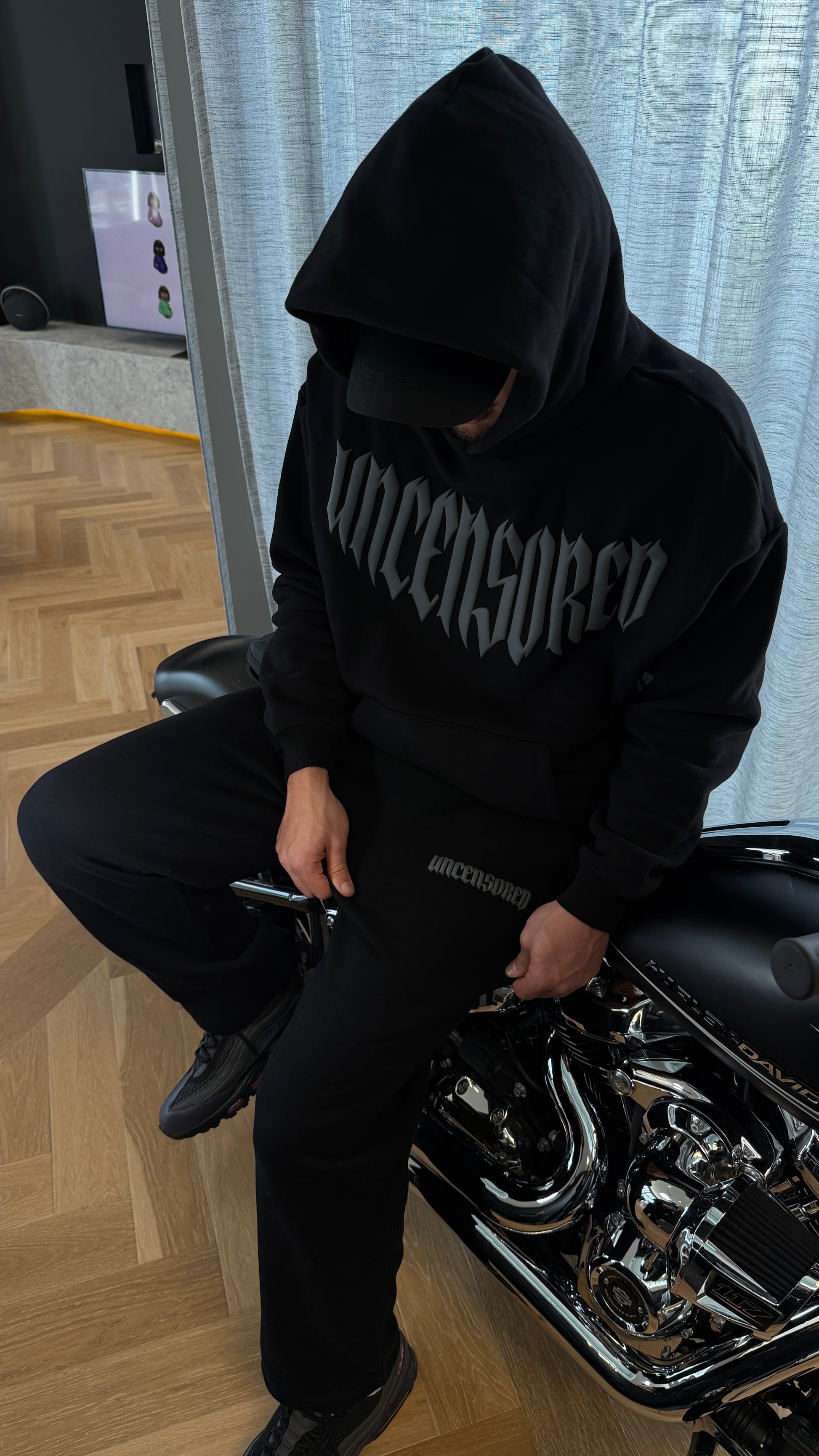The UNCENSORED™ Tracksuit Set in black. Cut from heavyweight brushed cotton fleece with a soft interior. Oversized hoodie with raised gothic logo at the chest and tonal No Risk, No Porsche detailing across the back. Paired with relaxed-fit joggers featuring minimal branding and drawstring waist.